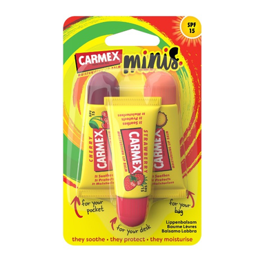 Набор бальзамов для губ в тюбике CARMEX c SPF 15 ассорти Клубника, Ананас с мятой, Вишня включает в себя три великолепных средства, которые обогащены ценнейшими компонентами, главными из которых являются фенол, ментол и камфора. Фенол интенсивно питает и увлажняет губы, защищая их от сухости и обветривания. Ментол как рукой снимает раздражение и ощущение дискомфорта. Камфора обладает охлаждающим, обезболивающим, успокаивающим и антибактериальным действием. Бальзам также обогащен такими компонентами, как салициловая кислота, натуральное масло какао и витамины. Средство обладает нежной текстурой, легко наносится и распределяется по поверхности губ.